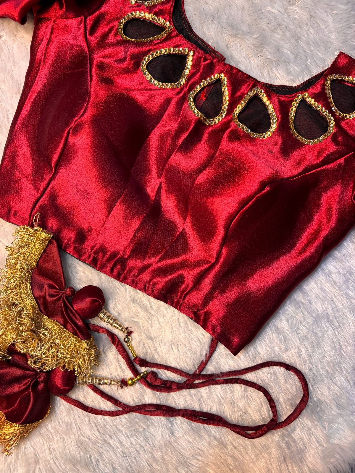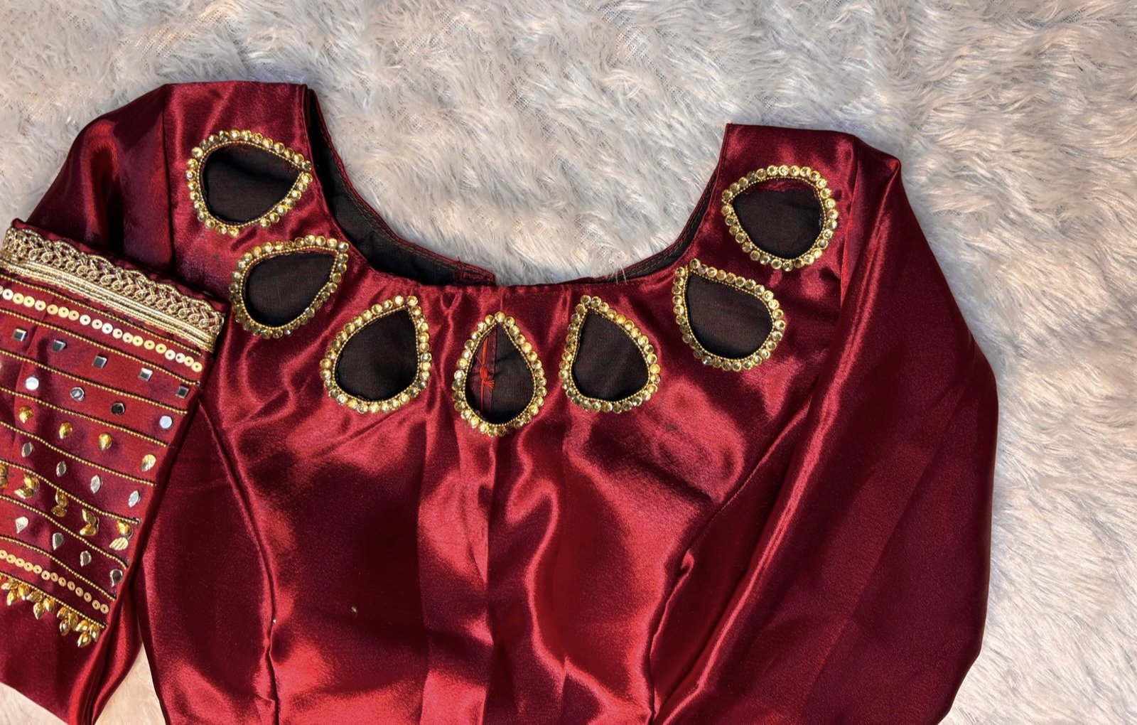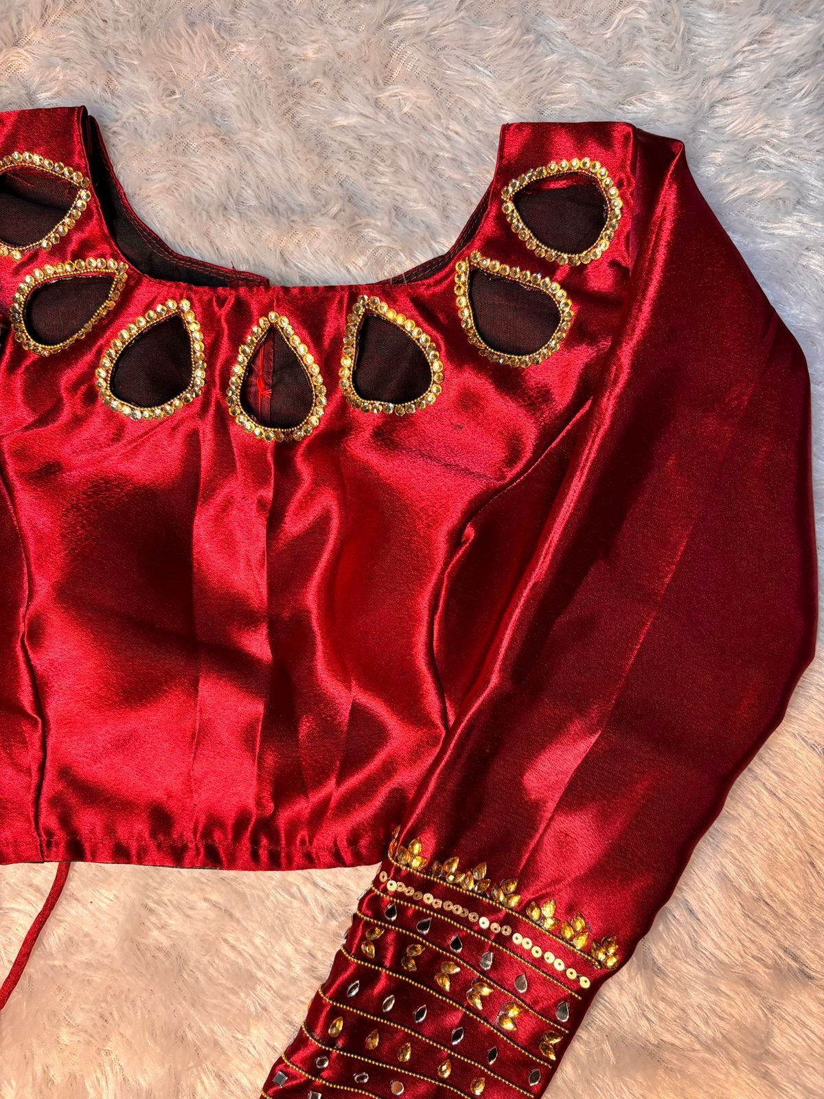 Turn heads with this elegant maroon satin blouse, designed to add a bold and refined touch to your ethnic ensemble. The blouse features a drop-cut front neckline intricately highlighted with shimmering stone embellishments, creating a graceful focal point. Its full-length sleeves are adorned with all-over stone work, offering a rich and glamorous appeal. Crafted from premium satin fabric, it ensures a soft, comfortable fit while enhancing your overall silhouette.